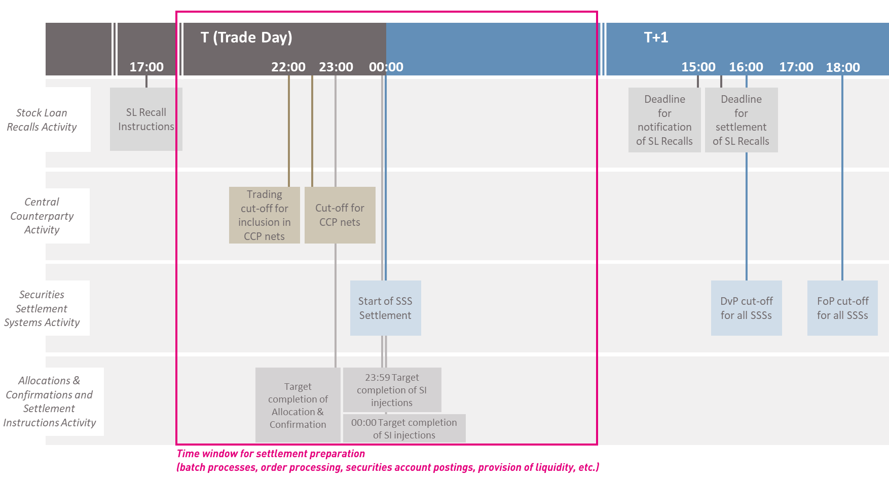 T+1 not only shortens settlement cycles. It also condenses the entire post-trade chain – from end-of-day netting to matching & confirmation to final book entry on the securities account side. In practice, this means that trading hours are extended and processing times are shortened.